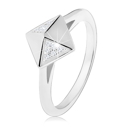 Prsten ze stříbra 925, zúžená hladká ramena, pyramida se dvěma lesklými a dvěma třpytivými stranami.Nabídku v našem katalogu pro vás připravuje tým odborníků. Nakupování na internetu je výhodnější než v kamenné prodejně, která má vyšší náklady.