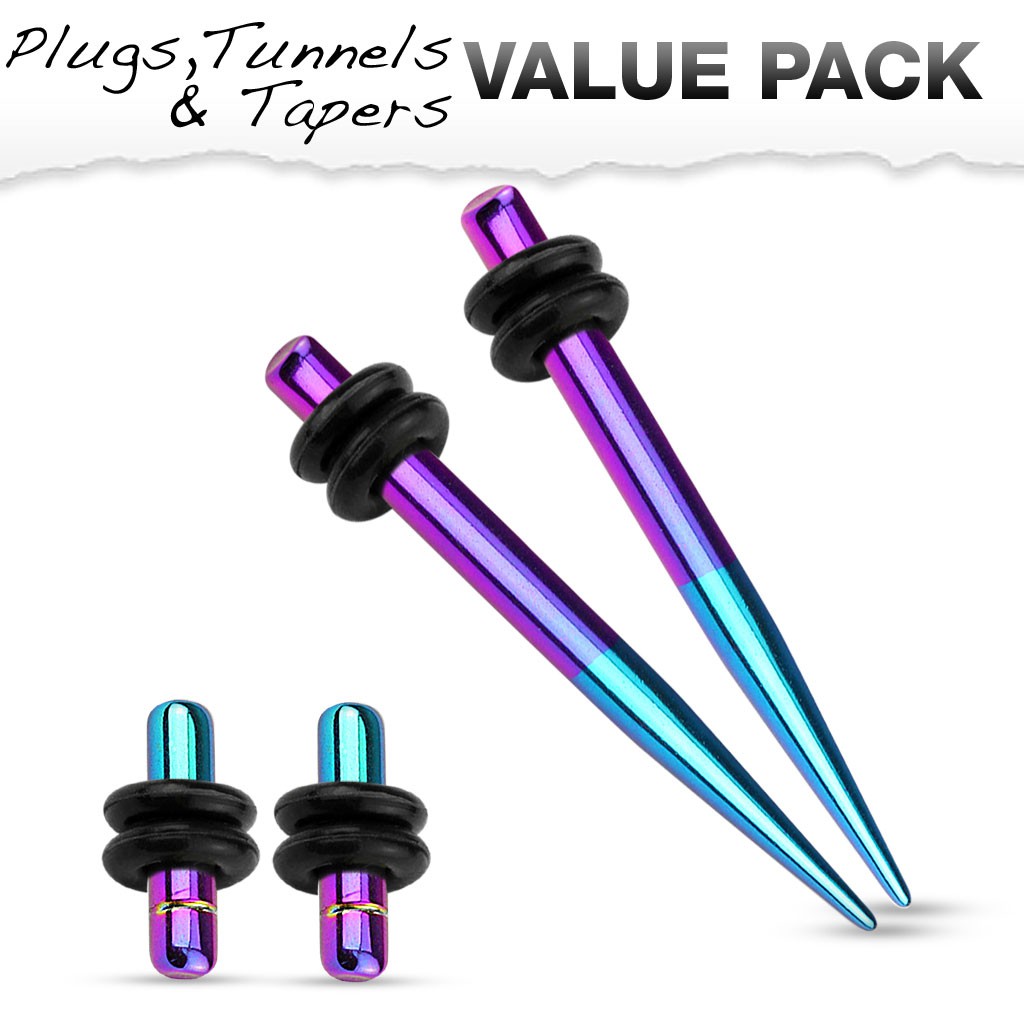 Čtyři piercingy do ucha - dva tapery a dva plugy, chirurgická ocel, titanová povrchová úprava v modro-fialovém provedení.Vybírejtee zboží v akci z pohodlí vašeho domova. Pokud budete spokojeni, doporučte nás prosím svým známým.