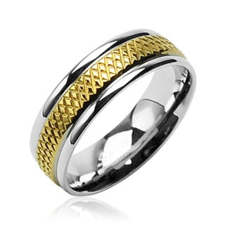 Popis produktu Snubní prsten z chirurgické oceli se středovým zlatým kosočtvercovým pruhem - Velikost: 63