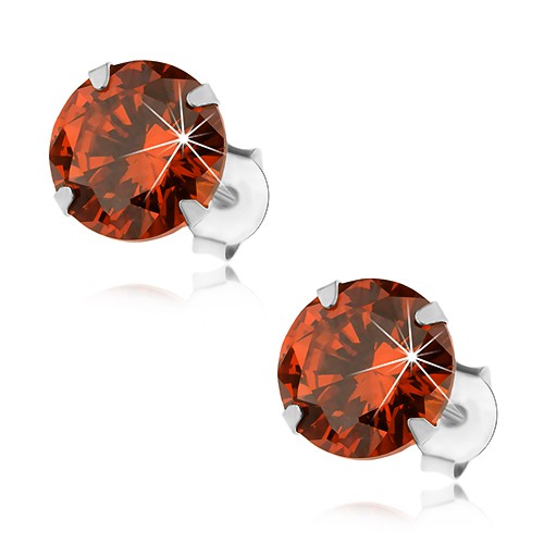 Stříbrné 925 náušnice, kulatý zirkon v oranžovém odstínu, 8 mm
