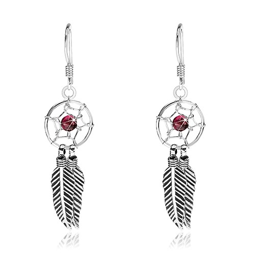 Popis produktu Stříbrné 925 náušnice, lapač snů, tmavě červený korálek a pírka, 10 mm