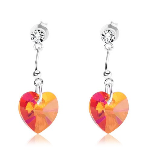 Stříbrné 925 náušnice, srdcovitý krystal Swarovski oranžové barvy