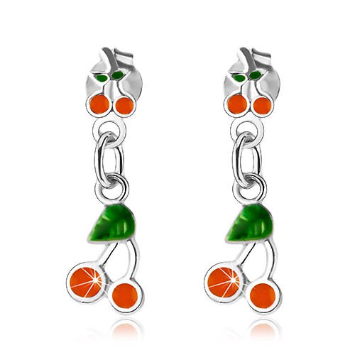 Stříbrné 925 náušnice, třešničky zdobené oranžovou a zelenou glazurou