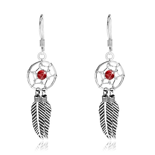 Popis produktu Stříbrné náušnice 925, lapač snů s červenou kuličkou a pírky, 10 mm