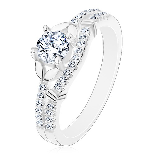 Popis produktu Stříbrný 925 prsten, čirý zirkon, dvojice lístečků a linie drobných zirkonků - Velikost: 54