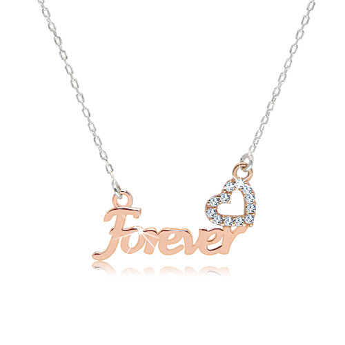 Popis produktu Stříbrný náhrdelník 925 - nápis "Forever" v růžovozlatém odstínu, zirkonové srdíčko