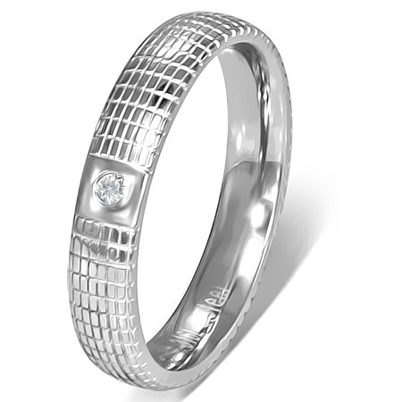 Prsten z chirurgické oceli stříbrné barvy, lesklý povrch, mřížkované rýhování, čirý zirkon.Nakupujte v našem e-shopu za skvělé ceny. Naše heslo: kvalita, výhodná cena, prozákaznický přístup.
