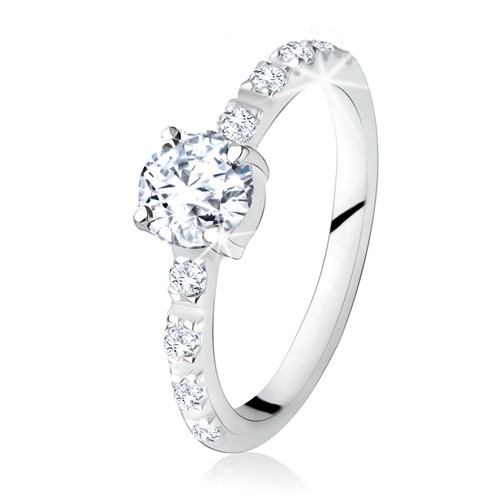 Popis produktu Stříbrný prsten 925, kulatý čirý kamínek, ramena zdobená zirkony - Velikost: 49