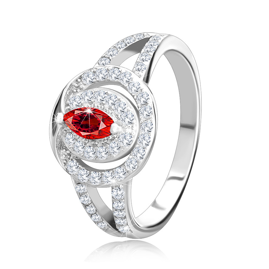 Popis produktu Stříbrný prsten 925, mohutná ozdoba - čirá zirkonová obruč s červeným zirkonovým zrnkem, zdvojená ramena - Velikost: 49