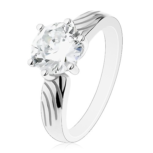 Popis produktu Stříbrný prsten 925, velký kulatý zirkon čiré barvy, zářezy na ramenech - Velikost: 60