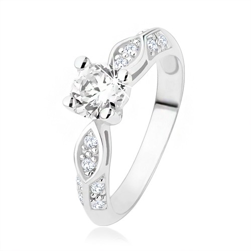 Zásnubní prsten ze stříbra 925, vypouklá ramena zdobená čirými kamínky a oválem, kulatý broušený zirkon v kotlíku.Čekáme, že tahle nabídka se zařadí mezi bestsellery. Udělejte si radost.