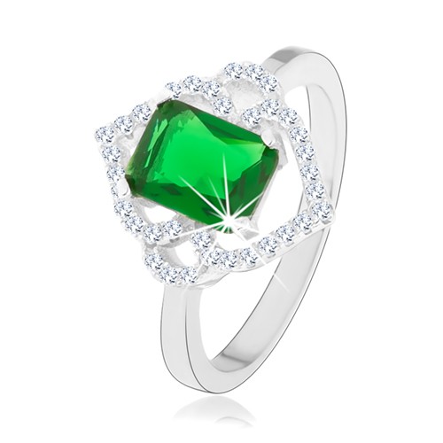 Popis produktu Stříbrný prsten 925, zelený obdélníkový zirkon, čiré obrysy lístků, obloučky - Velikost: 57
