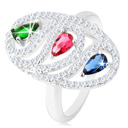 Popis produktu Stříbrný prsten 925, zirkonová oválná kontura, barevné broušené kapky - Velikost: 51