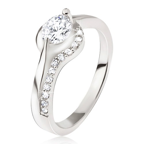 Popis produktu Stříbrný prsten, okrouhlý čirý kamínek, zaoblená ramena, zirkonky - Velikost: 59