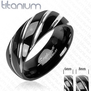 Popis produktu Titanový prsten černé barvy - úzké šikmé zářezy ve stříbrném odstínu - Velikost: 50
