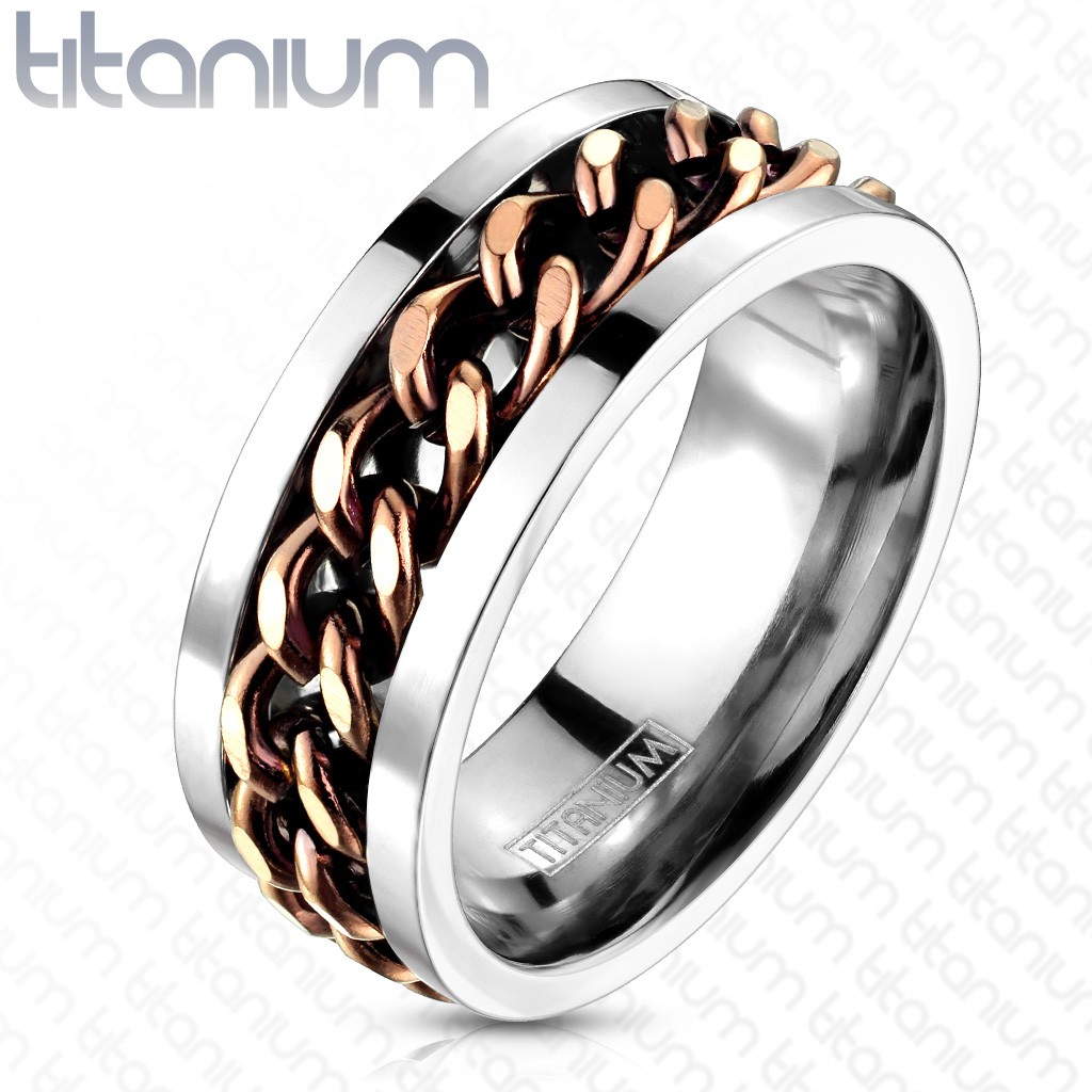 Popis produktu Titanový prsten stříbrné barvy - řetěz v měděném barevném odstínu - Velikost: 62