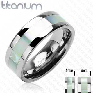 Popis produktu Titanový prsten stříbrné barvy s perleťovým pruhem uprostřed - Velikost: 71