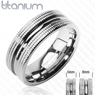 Popis produktu Titanový snubní prsten s lesklým středovým pruhem a vroubkovanými okraji - Velikost: 71
