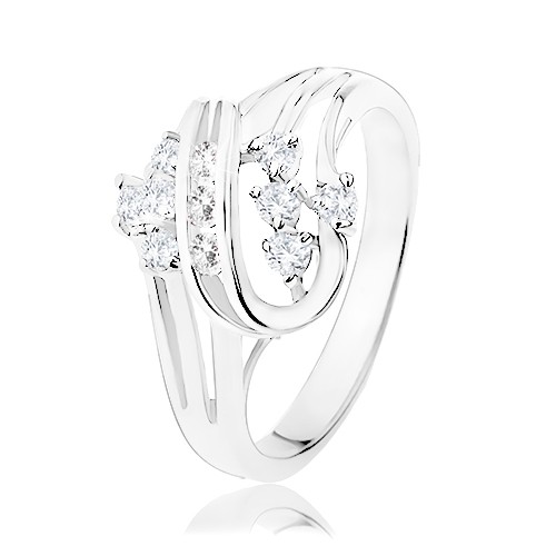 Popis produktu Třpytivý prsten s rozdělenými rameny, zatočené linie, čiré zirkonky - Velikost: 51