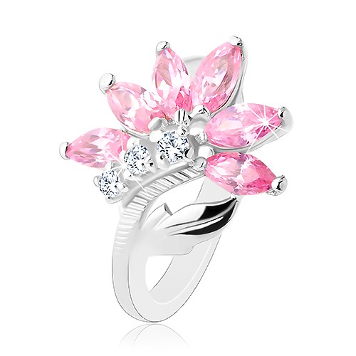 Popis produktu Třpytivý prsten stříbrné barvy, růžovo-čirý zirkonový květ, lesklý list - Velikost: 57