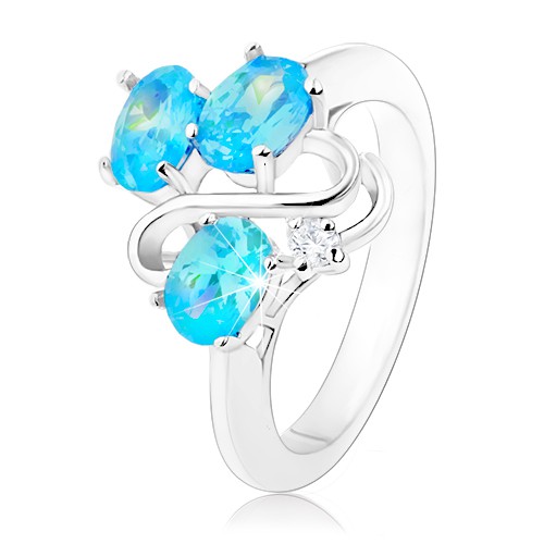 Popis produktu Třpytivý prsten stříbrné barvy, zvlněná linie, tři ovály akvamarínové barvy - Velikost: 49