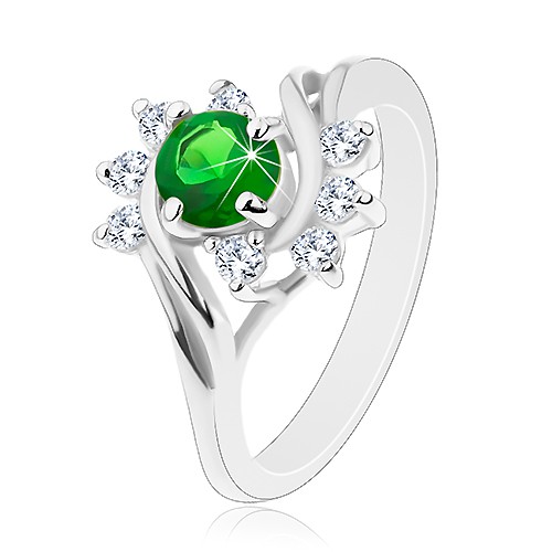 Popis produktu Třpytivý prsten ve stříbrném odstínu, zeleno-čiré zirkony, hladké oblouky - Velikost: 52