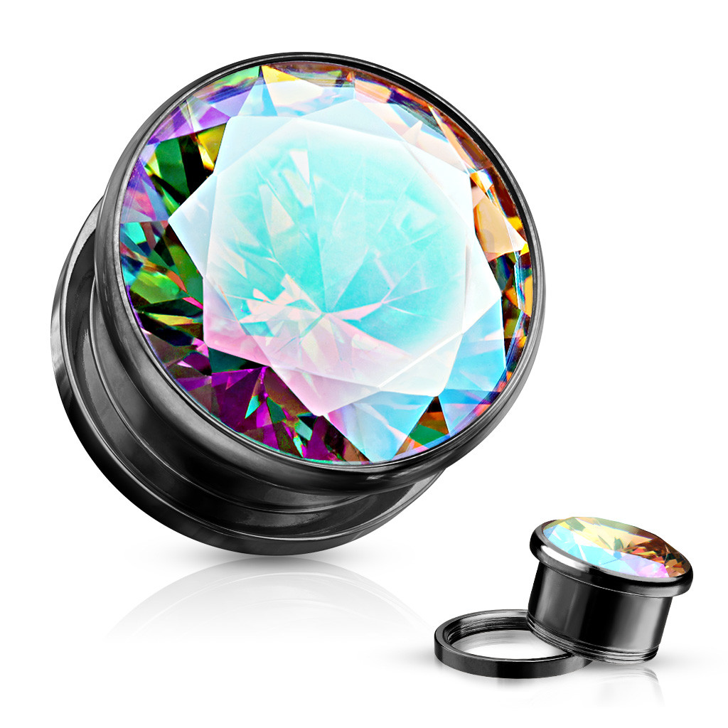 Popis produktu Tunel do ucha z 316L oceli, kulatý duhový zirkon, černý lesklý povrch, PVD - Tloušťka : 6 mm