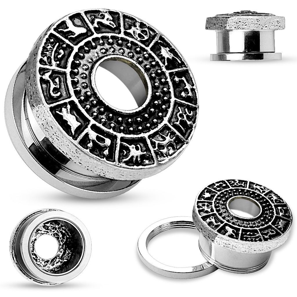 Popis produktu Tunel do ucha z oceli 316L, stříbrná barva, patinovaný zvěrokruh - Tloušťka : 14 mm