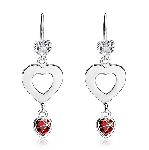 Popis produktu Visací náušnice, stříbro 925, tři srdce - dvě zirkonové, jedno ploché s výřezem