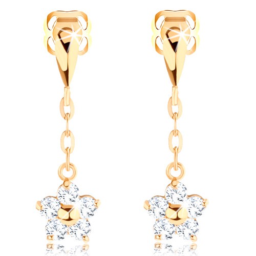 Popis produktu Visací náušnice ve žlutém 14K zlatě - slzička, čirý květ na řetízku