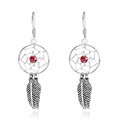 Popis produktu Visací náušnice ze stříbra 925, kruhový lapač snů, tmavě červený korálek, 15 mm