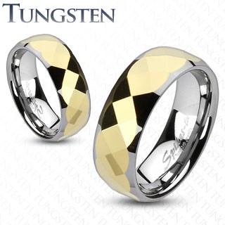 Popis produktu Wolframový prsten - dvoubarevný, zlatý geometricky broušený střed - Šířka: 6 mm, Velikost: 63