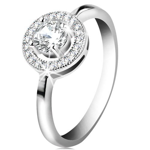 Popis produktu Zásnubní prsten ze stříbra 925, kulatý čirý zirkon v blýskavém kroužku - Velikost: 53