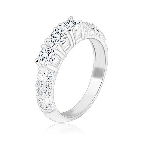 Popis produktu Zásnubní prsten ze stříbra 925 - tři třpytivé zirkony, menší zirkonky na ramenech - Velikost: 62