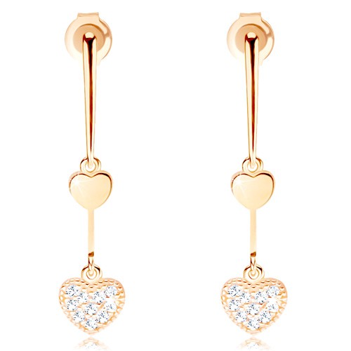 Popis produktu Zlaté náušnice 585 - zúžená tyčinka, dvě srdíčka - hladké a třpytivé