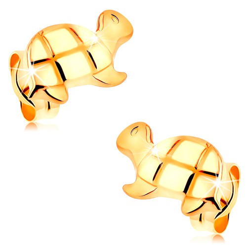 Popis produktu Zlaté puzetové náušnice 585 - lesklá želva s gravírovanými detaily