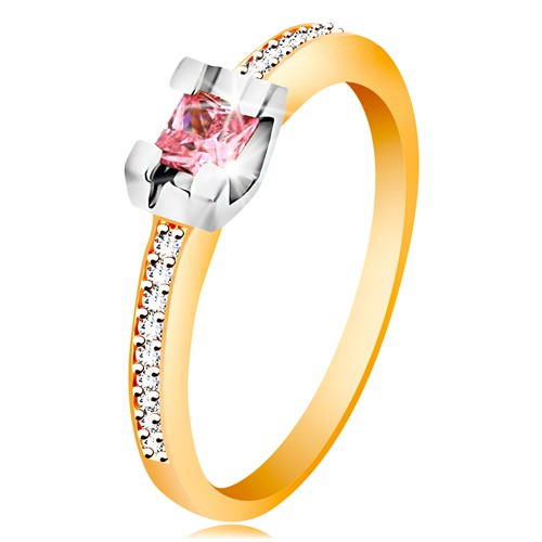 Popis produktu Zlatý 14K prsten - třpytivá ramena, kulatý růžový zirkon v kotlíku z bílého zlata - Velikost: 54