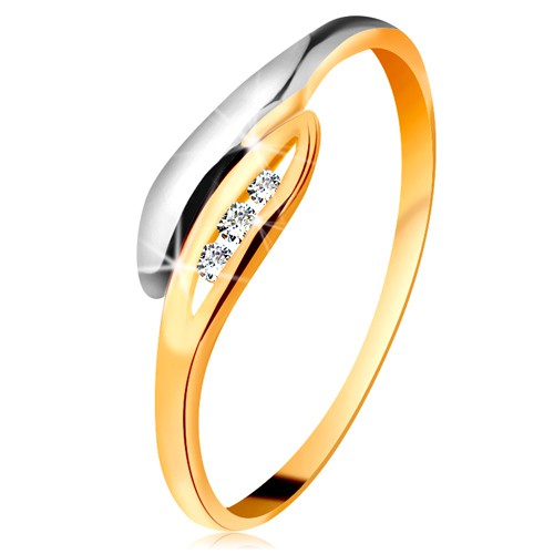 Popis produktu Zlatý diamantový prsten 585 - dvoubarevné zahnuté lístečky, tři čiré brilianty - Velikost: 50