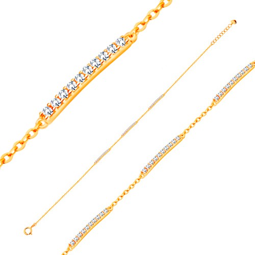 Popis produktu Zlatý náramek 585 s oválnými očky a třemi blýskavými liniemi zirkonů