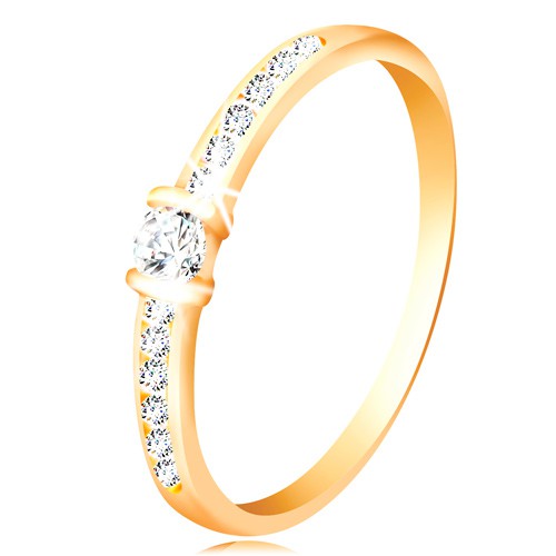 Popis produktu Zlatý prsten 14K - čirá třpytivá ramena, vyvýšený kulatý zirkon čiré barvy - Velikost: 49