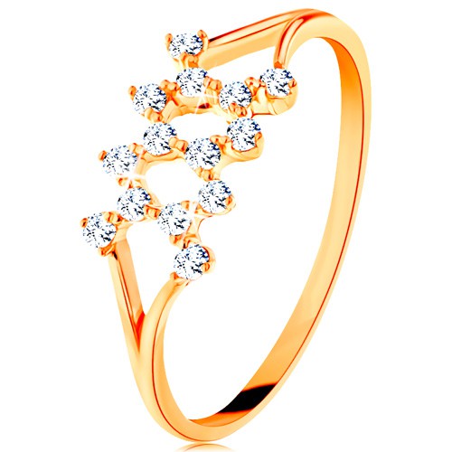 Popis produktu Zlatý prsten 585 - rozdělená zahnutá ramena, vzor cik-cak ze zirkonů - Velikost: 49