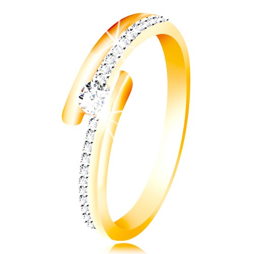 Popis produktu Zlatý prsten 585 - rozdvojená ramena s kombinací bílého zlata, vystouplý kulatý zirkon čiré barvy - Velikost: 49