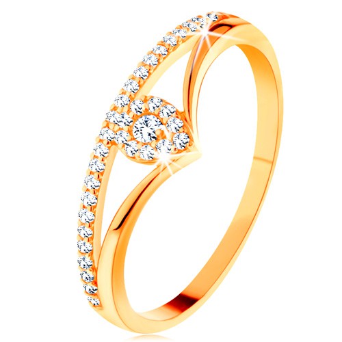 Popis produktu Zlatý prsten 585 - rozdvojená zahnutá ramena, čirá zirkonová kapka - Velikost: 51