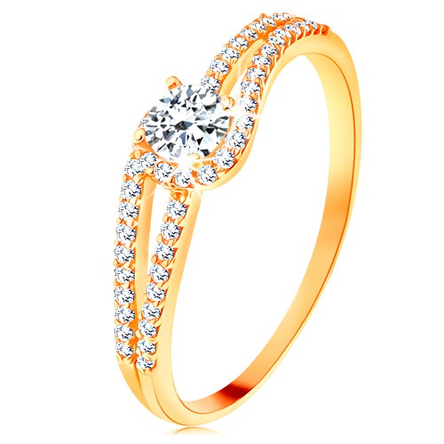 Popis produktu Zlatý prsten 585 s rozdělenými třpytivými rameny, čirý zirkon - Velikost: 49