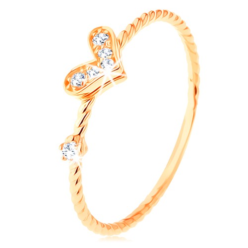 Prsten ze žlutého 14K zlata, úzká spirálovitá ramena, blýskavé srdce a kulatý zirkonek čiré barvy.Upozorňujeme, že nabídka má omezenou platnost. Udělejte si radost.