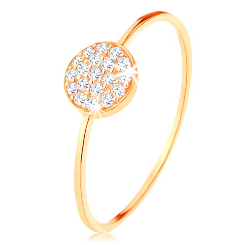 Popis produktu Zlatý prsten 585 - tenká lesklá ramena, kruh vykládaný čirými zirkony - Velikost: 52