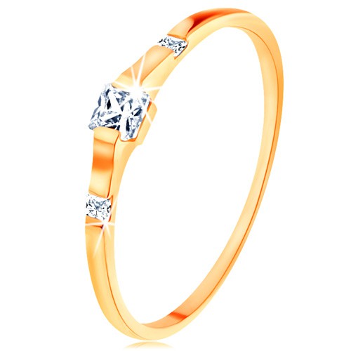 Zlatý prsten 585 - tři čiré zirkonové čtverečky, lesklá a hladká ramena - Velikost: 49