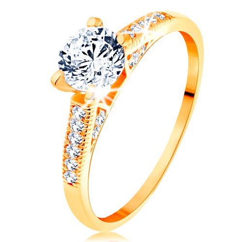 Popis produktu Zlatý prsten 585 - třpytivá ramena, vyvýšený kulatý zirkon čiré barvy - Velikost: 48