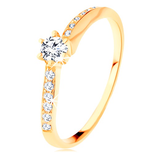 Blýskavý prsten ve žlutém 14K zlatě, tenká zvlněná ramena s lesklým povrchem, kulaté čiré zirkony.Vybírejte to nejlepší u nás. Úspora a spokojenost z nákupu, záleží nám na vaší spokojenosti.
