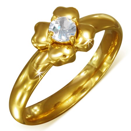 Popis produktu Zlatý prsten z chirurgické oceli s čirým zirkonem - květ - Velikost: 55